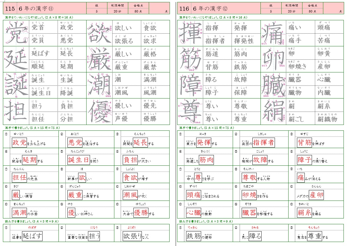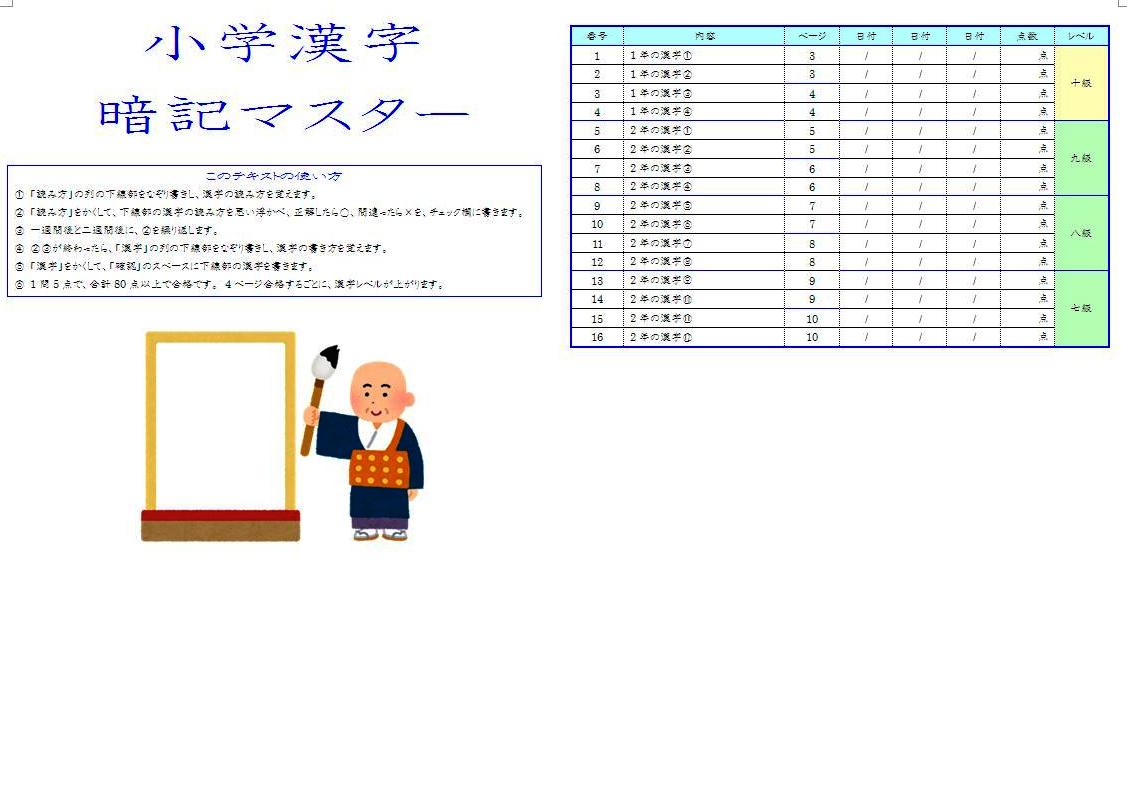 | 小学漢字 暗記マスター 小学校6年間で学習する漢字を、効率良く暗記して覚えるためのテキストです☆ まずは、漢字の読み書きを覚えるために、薄い字をていねいになぞって書きます。 漢字の列と読みの列に分かれているので、片側を隠して当てていくことで、短時間のうちに漢字を覚えることが出来ます☆ ○×をつけるチェック欄が3列あるので、1週間おきの復習を3回繰り返して、覚えた漢字を忘れないようにします☆ 無料学習プリントはこちら e6kanji1.pdf へのリンク 目次 e6kanji2.pdf へのリンク 1年の漢字①②③④の無料学習ファイル e6kanji3.pdf へのリンク 6年の漢字⑫⑬⑭⑮の無料学習ファイル |